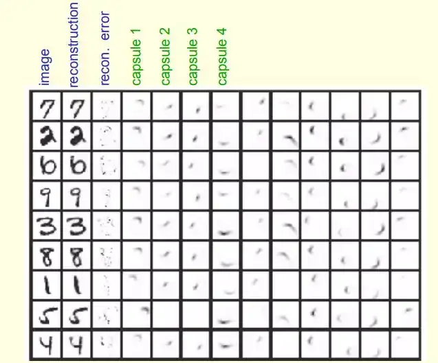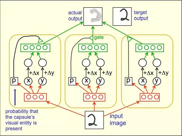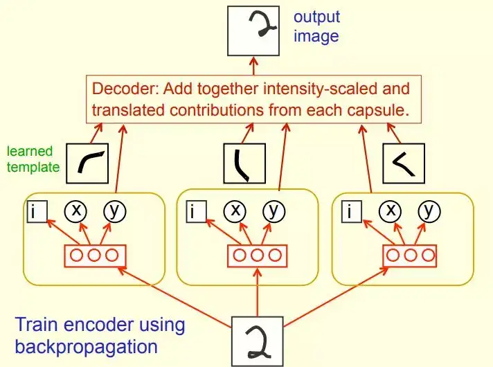 具体看看胶囊神经网络想做什么,假设我们训练一个识别数字2的网络,我们首先做的是在每一层训练一些胶囊(即一组相对独立的神经元),每一个胶囊只负责图形中的一个子结构,例如图中的三个胶囊,分别识别横线,竖线和锐角,每个胶囊给出图形中每个位置出现自己负责识别的特征的概率(intensity),之后再通过一个编码器,综合每一个胶囊给出的在各个位置的强度信息,最终得到经过重构后的图像。
