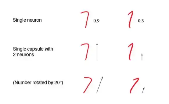 例如我们关注的是识别数字7,那么下图中的第一行是传统的神经元,会给出对应图形是不是7的概率,但这个神经网络却无法识别第三行的数字。一个包含两个神经元的胶囊可以一个识别图形的翻转情况,一个识别具体的形状。不管图形是第二行那样竖直站立的,还是像第三行那样歪倒的,胶囊网络都可以正确的识别。