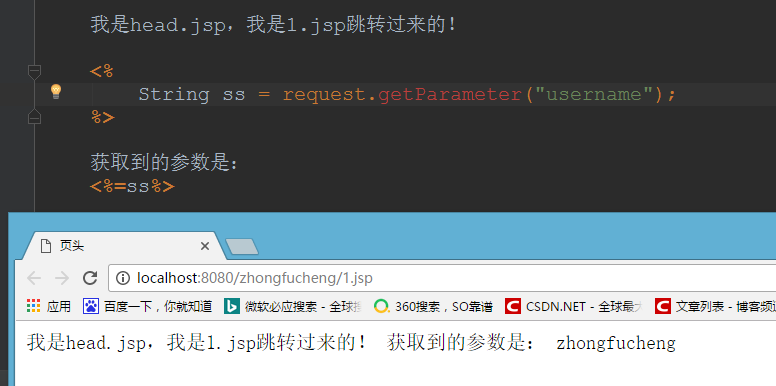 - 在跳转到head.jsp时传入参数username值为zhongfucheng