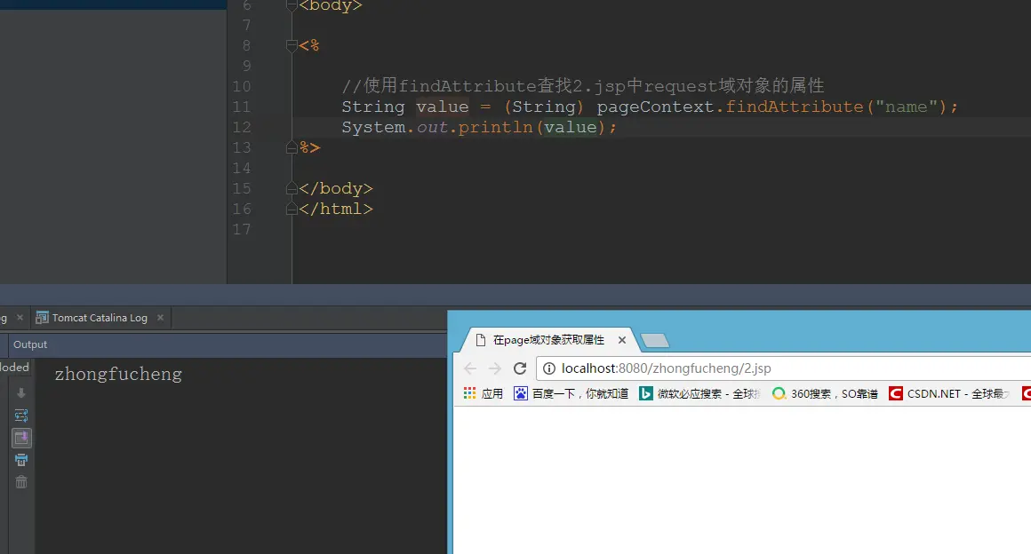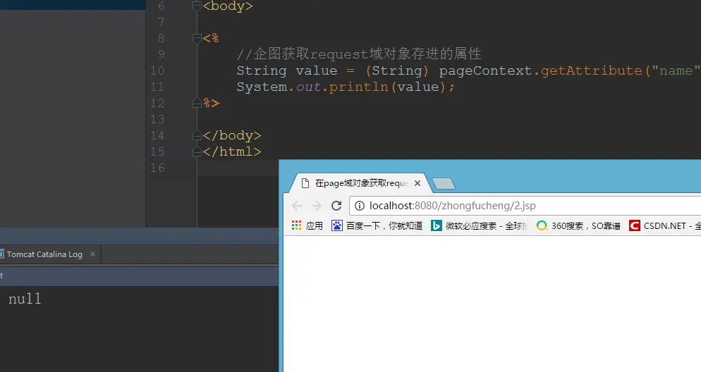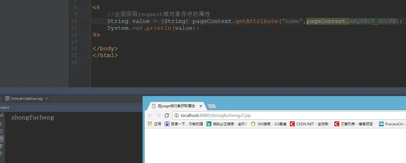 刚才我们没有使用重载方法的时候,使用pageContext是无法获取到request域对象设置的属性的。现在我们使用重载后的方法看一下能不能获取得到!