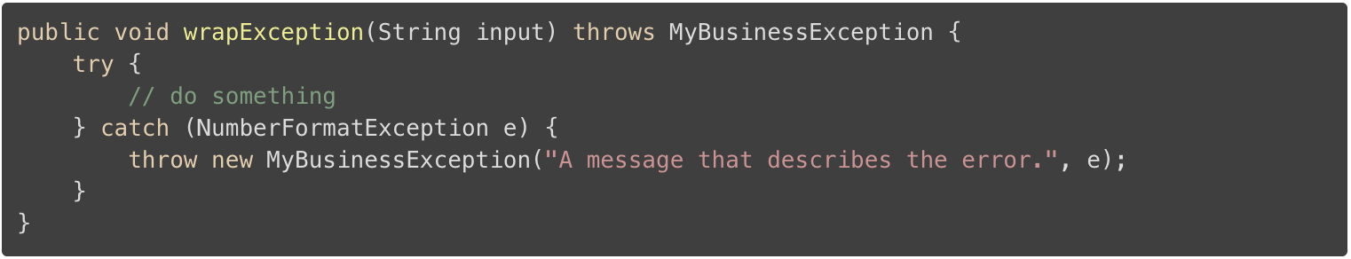 附加消息也不会添加任何信息。正如在最佳实践#4中所解释的那样,异常消息应该描述异常事件。 堆栈跟踪告诉你在哪个类,方法和行中抛出异常。