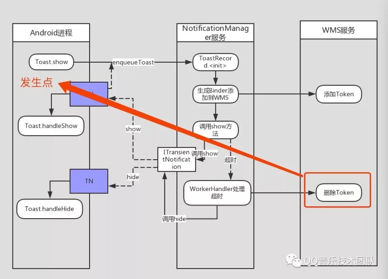 Toast调用show方法的时候 ,实际上是将自己纳入到NotificationManager的Toast管理中去,期间传递了一个本地的TN类型或者是ITransientNotification.Stub的Binder对象NotificationManager收到Toast的显示请求后,将生成一个Binder对象,将它作为一个窗口的token添加到WMS对象,并且类型是TOASTNotificationManager将这个窗口token通过ITransientNotification的show方法传递给远程的TN对象,并且抛出一个超时监听消息scheduleTimeoutLockedTN对象收到消息以后将往Handler对象中post显示消息,然后调用显示处理函数将Toast中的View添加到了WMS管理中,Toast窗口显示NotificationManager的WorkerHandler收到MESSAGE_TIMEOUT消息,NotificationManager远程调用进程隐藏Toast窗口,然后将窗口token从WMS中删除