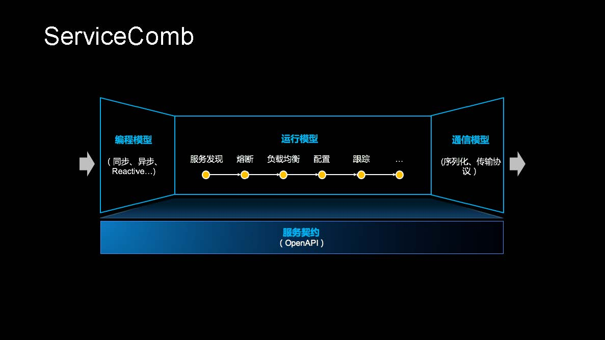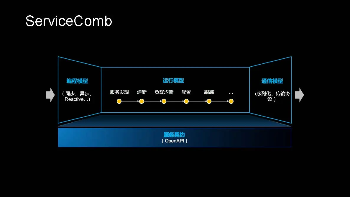 还有一块是在运行时通过插件方式提供的多种服务扩展能力,比如服务发现、熔断、负载均衡、配置以及跟踪等。由于为微服务是以独立进程的方式存在,微服务框架首先需要保证服务间的网络调用问题,同时由于云上这些网络调用是不可靠的,需要微服务框架通过容错、负载均衡来保证服务之间调用的可靠性。在编程模型上ServiceComb支持同步、异步、Reactive等编程模式。这里的通信模型主要负责消息的序列化以及传输协议。