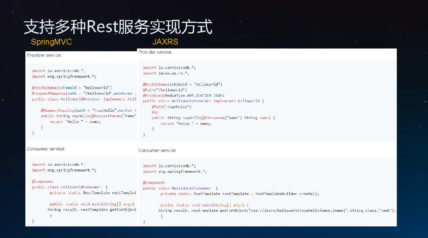 ServiceCombJava SDK通过直接分析服务接口的Class文件,直接从代码层面获取Restful接口描述信息,生产成契约描述信息。目前ServiceComb Java SDK支持Spring MVC 以及JAXRS 等Restful服务定义方式。