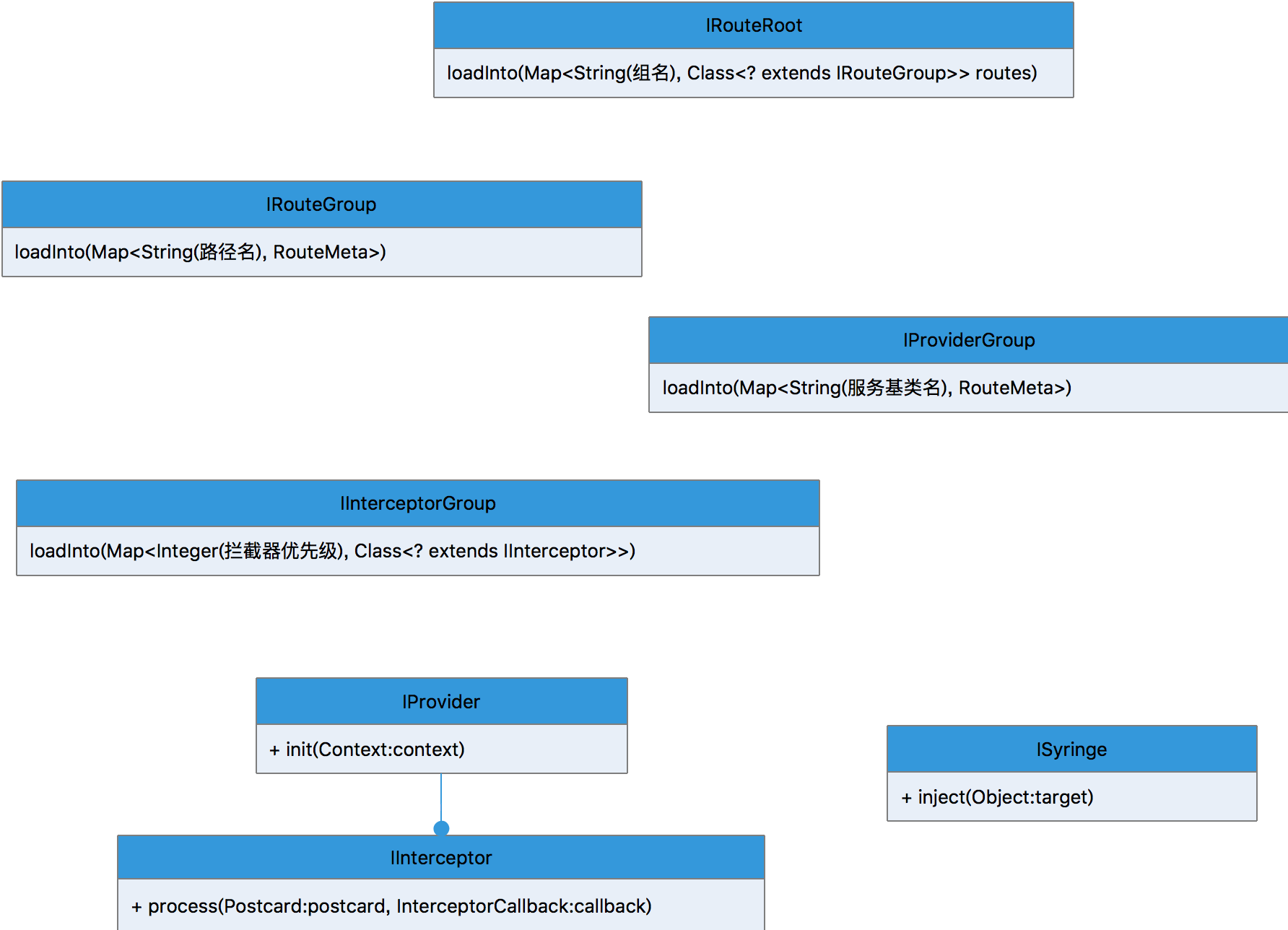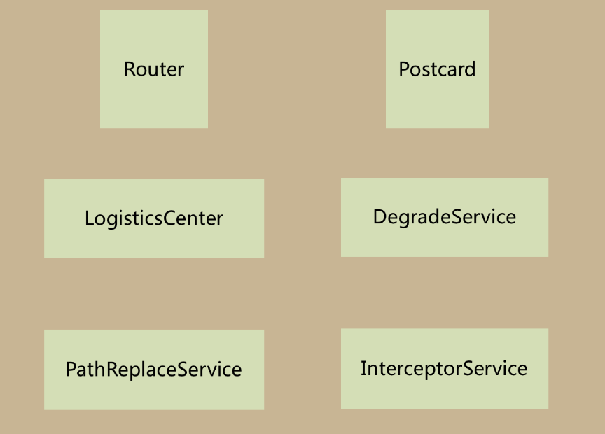 ARouter、Postcard、LogisticsCenter、DegradeService、PathReplaceService、InterceptroService这五个部分基本构成了ARouter的主体架构。