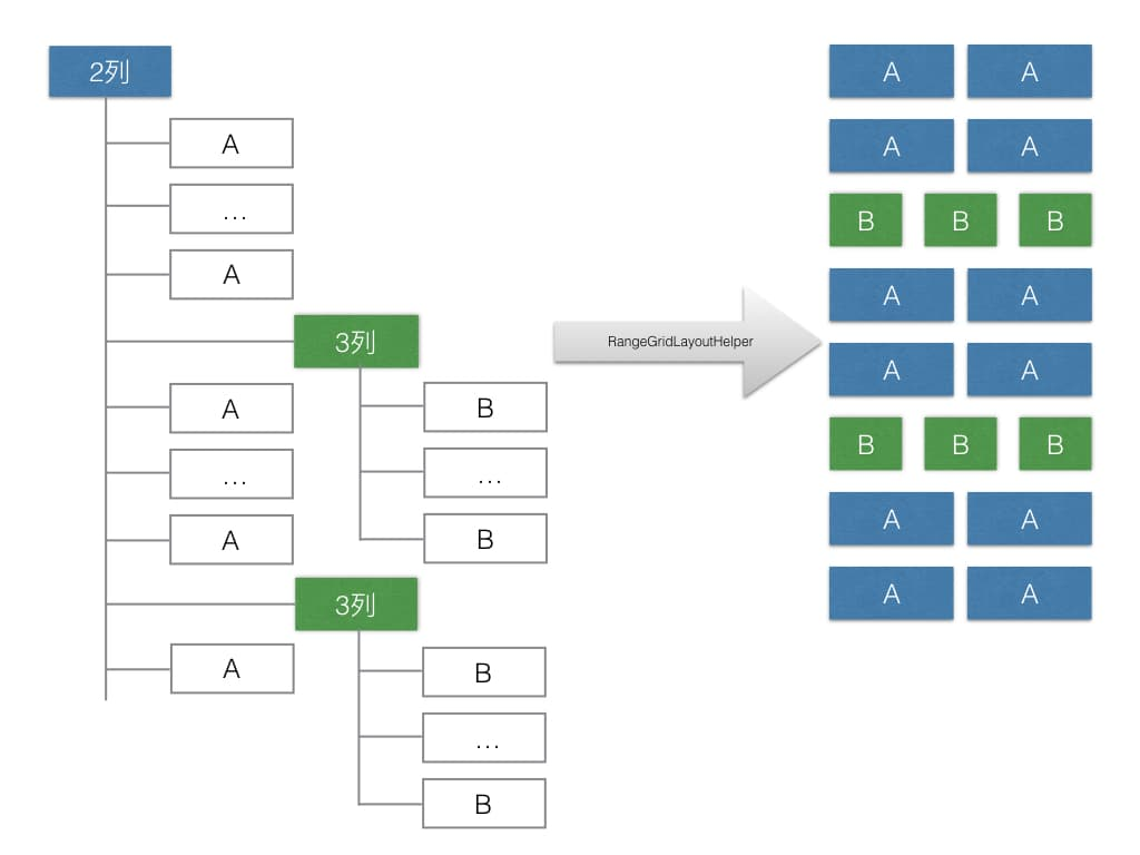 因此有必要侧重在端上进行设计,如果进一步考虑这个需求,可以将这种结构描述成一种树状结构。以上图为例,也就说处于根节点的的组件 A 列表,都是用 2 列结构的 GridLayoutHelper 来布局的,而根节点的组件列表里某些位置,插入一个组件 B 的列表,它们是用 3 列结构的 GridLayoutHelper 来布局的。这种描述可能有点抽象,以普通场景下、非 RecyclerView 里实现场景为例,也就是说假如要写一个自定义布局来绘制上述界面,其实就是写一个能进行 2 或 3 列布局的 ViewGroup,然后按照想要的结构自由组织就行了,然后最终我们就能得到一个 View 的树。但是这种嵌套的结构 View 在 RecyclerView 只能作为一个整体来进行回收复用,还不够扁平化,回收复用的粒度就达不到我们的要求,所以就提出了上述的逻辑上具备嵌套能力的树状结构。有了这样的逻辑结构来描述,就可以提供更加普适性的布局能力。解决这个问题的 LayoutHelper 就是本文要介绍的内容,它可以接收带逻辑上带嵌套结构的数据描述,同时又在最终布局的时候将每一个 item 组件扁平化地、直接地挂载到 RecyclerView 下。