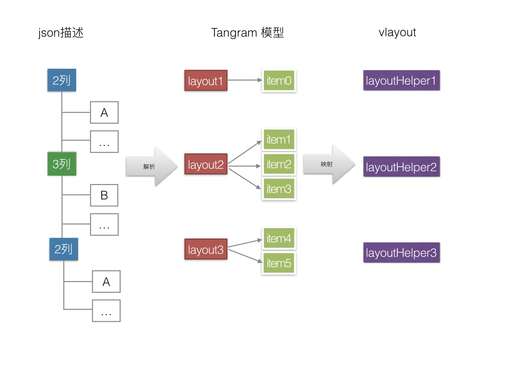 vlayout 虽然提供了异构布局的能力,但是我也承认,目前是接口(主要是 DelegateAdapter 以及各种 LayoutHelper 提供的接口)并不易用,开发者很难抛开那些具体的细节然后快速写出页面,在 Github 上也有同学反馈过这个问题。之所以这样其实是因为:我们团队自己也并不是直接使用 vlayout 进行开发,而是通过 Tangram 库来间接使用 vlayout,在 Tangram 主要是通过 JSON 数据来描述整体页面的结构,并封装了一个自定义的 Adater,它接收 Tangram 协议 JSON 数据,来自动创建、维护各种 LayoutHelper 的内部信息,这样就屏蔽了 vlayout 这些复杂的细节,而不是在使用 DelegateAdapter 的时候手动维护各个 LayoutHelper。建议到 Tangram 工程下进一步了解详细信息,对于原来使用 vlayout 开发的 app 来说,理论上都可以迁移到 Tangram 架构,这样整个页面的渲染就可以由数据来驱动,提升页面的动态性。