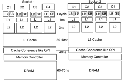 cpu对寄存器,store buffer,load buffer的访问是远远快于cache和memory的。而且在现代cpu的设计中,提升性能的主要方式就是提升并行度。而提升指令级并行的两种主要方式,包括增加流水线深度,和多发射流水线(每条流水线执行多条指令)。由于每条指令的执行时间由流水线上最耗时的阶段来决定,因此增加流水线的深度后,可以缩短每条指令的执行耗时。不过因为流水线每个阶段之间传递数据的耗时无法忽略,因此可增加的流水线的深度会存在上限。所以,另外一种方法就是让每条流水线执行多条指令。实现多发射流水线的方式包括静态多发射,和动态多发射。静态多发射可以理解为一条指令包含多个操作(VLIW [6])。动态多发射也叫超标量技术[7],一条流水线存在多个执行单元,可用于执行例如浮点计算,整型计算,store/load等。多条指令可以根据其依赖关系,实现并行执行。而且由于store/load buffer的存在,写入数据不必立马刷入内存,读取数据可以提前读取,因此可以进一步提升并行度。同时,对于分支指令,存在speculation execution(推测执行),最近爆出的cpu漏洞就是和这个技术有关。因此,从上面介绍的可知,我们的程序指令其实是乱序执行的。不过,为了保证正确性,执行后的结果却是顺序提交的,这样就防止出现分支预测失败,而导致执行了不该被执行的指令。在乱序执行的过程中,结果只会被暂存到物理寄存器和buffer中,只有当提交的时候,才会将更改写入ISA(指令级架构)寄存器和cache中。因此,当出现预测失败的时候,只要丢弃掉执行的结果就行,未提交的指令的修改不会对外暴露出来。多说一句,我们写汇编时候用到的寄存器其实是逻辑寄存器,或者说ISA寄存器,它们和真实的物理寄存器的之间存在映射关系。