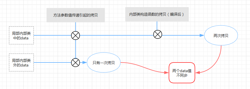 这里要注意的是: 1. 编译后,LocalInner并非直接使用data,而是用构造器拷贝一份后再使用 2. java是值传递的,所以包裹 LocalInner的外部方法outterPrint也会对传入的data参数做一次拷贝(基本类型数据拷贝副本,对象等则拷贝引用) OK,现在的情况是: 方法内的局部类对data拷贝了两次:外部方法outterPrint值传递时的拷贝,和LocalInner构造函数的拷贝 方法内除了局部类外的作用域只拷贝了data一次: 外部方法outterPrint值传递时的拷贝 拷贝两次和拷贝一次,导致在outterPrint方法内部, 局部类内部的data和局部类外部的data是不同步的! 也即你在局部类内部改了data不影响局部类外部的data,在局部类外部改了data也不影响局部类内部的data(注意一个前提,值是基本类型的,如果是对象的话因为拷贝的是引用仍然可以“同步”) 图示一: