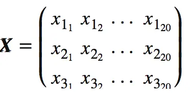 运行这段代码后,我们就生成了包含两个类别的样本数据,其中每一列都是一个三维的向量,所有数据是这样的矩阵: