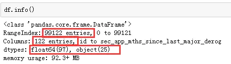可以看出一共包含了99122条记录,一共有121个特征和一个目标变量,这些列的类型分布:float64有97个,字符型有25个。