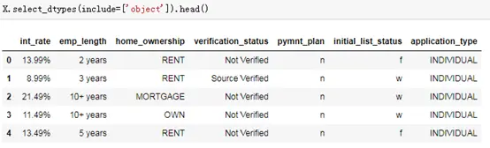 同时将init_rate转成float类型,将emp_length处理成int类型,对剩下的三个home_ownership,verification_status,initial_list_status类型变量做独热编码,使用pd.get_dummies函数,同时去除原始的那三个字段。