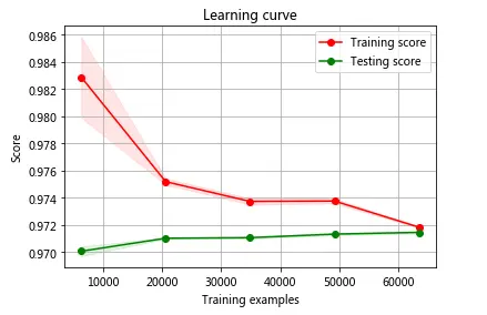 学习曲线是一条关于样本个数和经验损失函数之间的曲线,通过学习曲线可以看到关于偏差、方差用于改善机器学习算法的决策提供依据;从目前的曲线可以看出,训练得分和测试得分基本稳定在0.972这个点,相对来说比较理想。