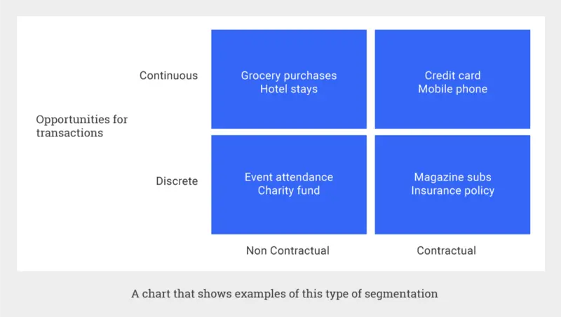Fader 和 Hardie 的模型根据用户是否与公司缔结合同以及交易是连续还是离散的来将用户行为做了区分。来看一个关于这个模型的例子:
