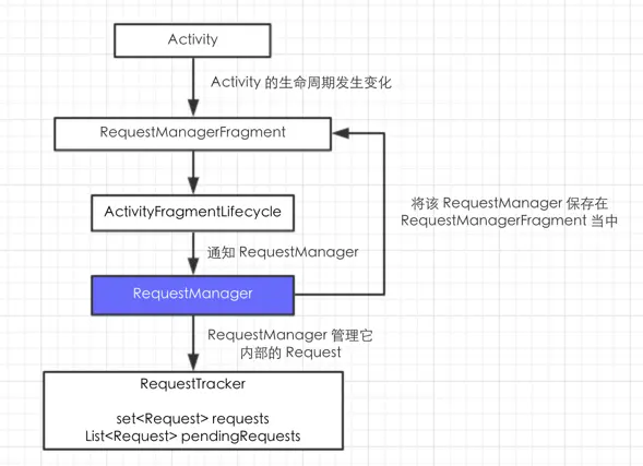with(Activity activity)是Glide的一个静态方法,当调用该方法之后会在Activity中添加一个Glide内部自定义的RequestManagerFragment,当Activity的状态发生变化时,该Fragment的状态也会发生相应的变化。经过一系列的调用,这些变化将会通知到RequestManager。RequestManager则通过RequestTracker来管理所有的Request,这样RequestManager在处理请求的时候,就可以根据Activity当前的状态进行处理。
