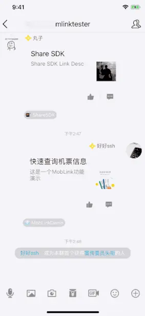 仔细思考后问题确定为如何通过分享一个链接给好友,好友点击后能够直接回到app去操作,确定好这一方案后就开始找市场上有没有已经成熟的解决方案,经过一些搜索,对比后找到下面这样一个demo,先给大家看一下QQ里的效果图: