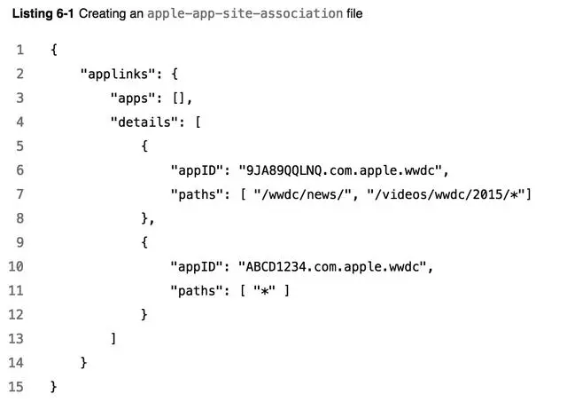 上面是苹果官方对这个文件定义的示例,可以看到这是一个json文件,但文件名只是’apple-app-site-association’不带任何后缀,也不用指定格式。