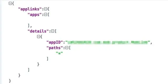 这里需要特别说明一下,这个文件里的’applinks’和其中的‘apps’务必保持与上图中一致,即使’apps’是一个空数组,也要让它就是个空数组!重点是’details’数组里的每一个字典,每一个字典对应上述域名下的一个路径,只有在这里写了的路径才能打开app,不过值得庆幸的是这里可以使用类似于正则的方式做匹配。说到这里我就要说一下上面那个demo对应的这个特殊文件里的内容了,详见下图: