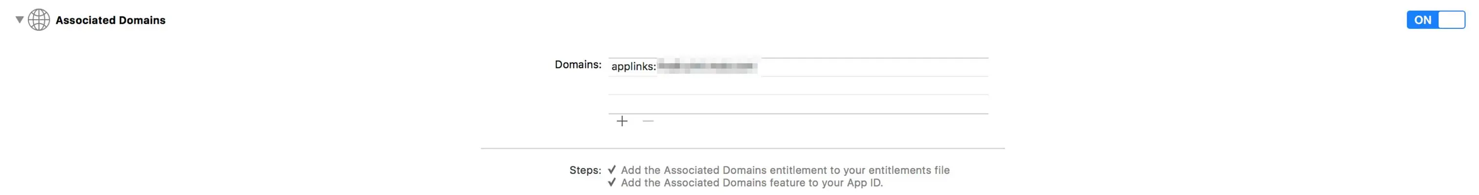 最后,做好上面的准备工作之后下面就是客户端的配置了。首先证书的配置,这个没什么好说的,只要创建证书的时候打开对应的开关就好了。其次,需要在Xcode里的’Capabilities’里开启’Associated Domains’,并使用上述域名,按固定格式:’applinks:<domain>’配置好,最终示例截图如下:
