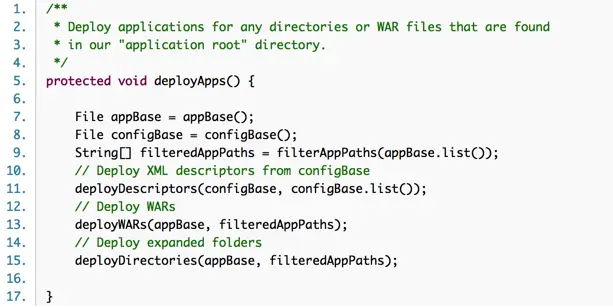 前一篇文章讲了org.apache.catalina.startup.HostConfig的 lifecycleEvent 方法中所做的事情。最后看到在 Tomcat 启动时或启动后(后台线程定时扫描)会调用 HostConfig 类的 deployApps 方法:
