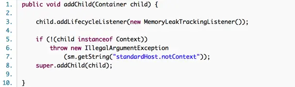 第一段是在所有 Context 对象构建时会添加一个监听器,这里监听器的类名是 StandardHost 类的实例变量 configClass ,其默认值就是org.apache.catalina.startup.ContextConfig。第二段是将当前构建的 Context 对象添加到父容器 Host 对象中。