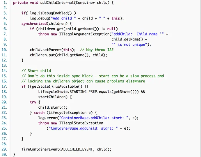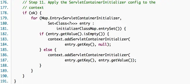 即给 host 对象添加子容器时将会调用子容器的 start 方法,按照前面文章的分析,调用 StandardContext 的 start 方法最终会调用org.apache.catalina.core.StandardContext类的 startInternal 方法(该方法代码较长,建议自己阅读,不再贴出),这里将会发布一系列事件,按调用前后顺序这些事件包括:BEFORE_INIT_EVENT、AFTER_INIT_EVENT、BEFORE_START_EVENT、CONFIGURE_START_EVENT、START_EVENT、AFTER_START_EVENT。