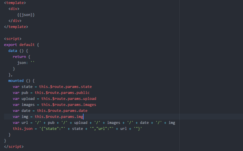 3、创建一个页面展示JSON数据。我直接用路由参数接收返回的结果后再拼接,整个JSON接收不到,所以只好拆开了,没有显示所有的JSON,只获取state和url。暂时不懂不访问接口用什么方式接收后端数据,如果有好的解决方式欢迎提出。
