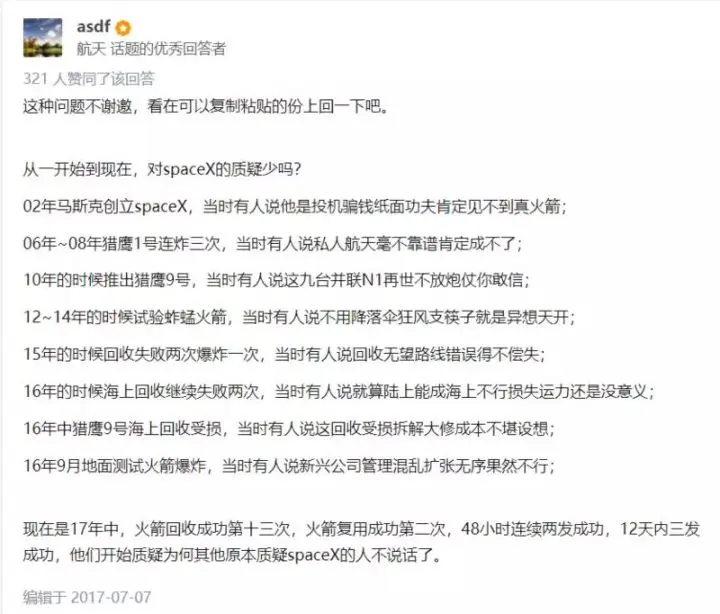 曾有人在知乎上提出了一个关于 SpaceX 的问题:“为什么知乎的航天爱好者对于 SpaceX 有近乎于「宗教膜拜」式的推崇,容不得对 SpaceX 的半点质疑?”,这里援引自知乎航天话题优秀答主“asdf”的回答: