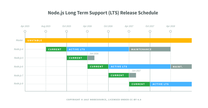 Node.js 每年进行两次大的发布,2017年10月,Node.js发布了 9.0 版本,与此同时, Node.js 8.9.0 成为了最新的 LTS 版本。这意味着对 8.9.0 的支持将会维持到2019年底,此后的一个LTS版本将会是 Node.js 10