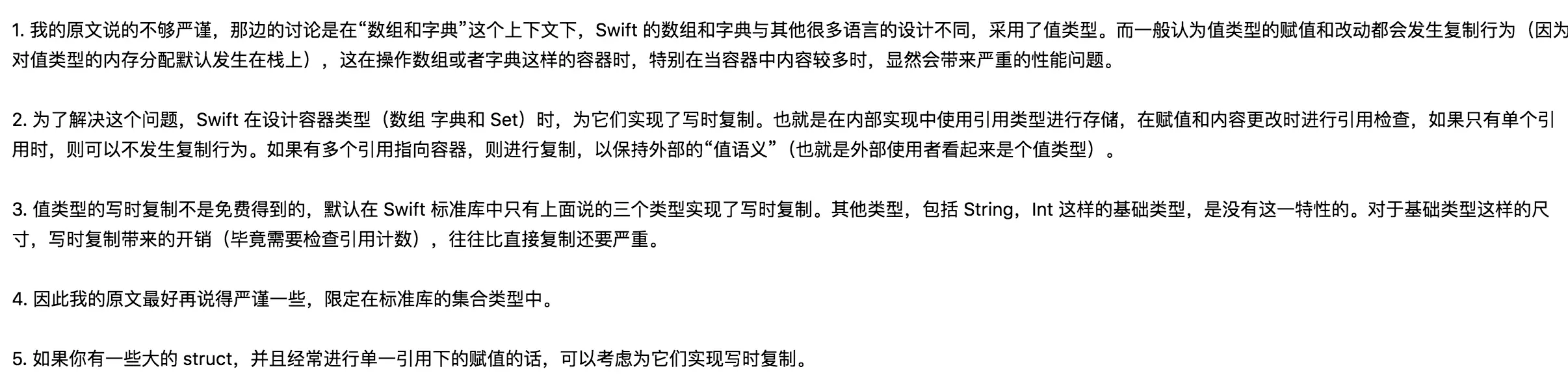 显然,值类型的值并非是在改变的时候才去复制,而是在赋值的时候就会进行复制! 这个结论显然是有问题的! 如果把上面的每一种类型拆开的话可以得到的结论大概是Int,Double, String, Struct等)是在赋值的时候复制的,为什么?因为对于基本类型来讲写时复制带来的开销其实有时比直接复制带来的开销更大!而对于集合类型来讲,当然上面我的实例是数组,它直接复制的只是一个引用而已,集合类型(Array,Dictionary,Set)并非是在赋值时复制的,而是在写时复制的!