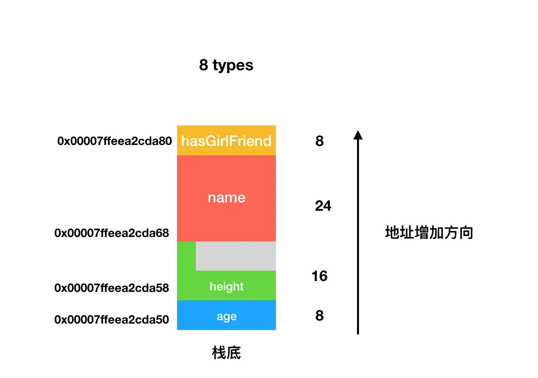 MemoryLayout<Type>是一个泛型,通过它的三个属性可以获取具体类型在内存中的分配:size表明该类型实际使用了多少个字节;alignment表明该类型必须对齐多少字节(如为8,意味着地址的起点地址可以被8整除);stride表明从开始到结束一共需要占据多少字节。 Swift中基本类型的size和stride在内存中是一样的 (可选型如Double?实际使用了9个字节,但是却需要占据16个字节) 内存对齐的好处这里针对内存对齐的好处有了比较详尽的描述,主要是速度快。