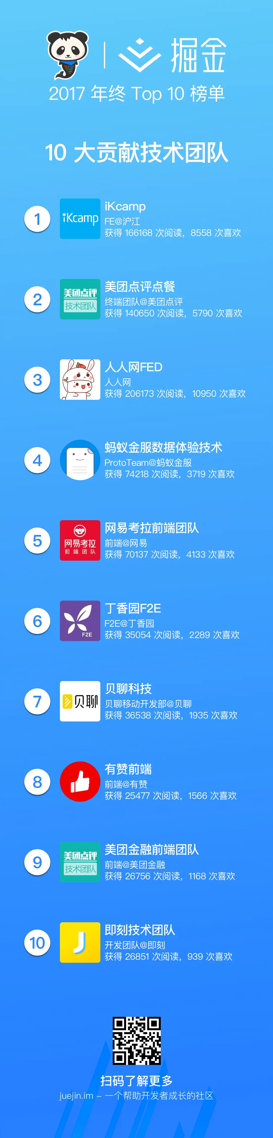 除了上述的 10 个贡献许多的技术团队,滴滴WebApp架构组、ScalaCool - 水滴技术团队、百姓网技术团队、迅雷前端、酷家乐前端团队、随手记技术团队、51信用卡大前端团队、摩拜单车前端团队等等公司都在掘金上有非常多的付出!现在有超过 100 个一线技术团队在通过掘金分享技术!