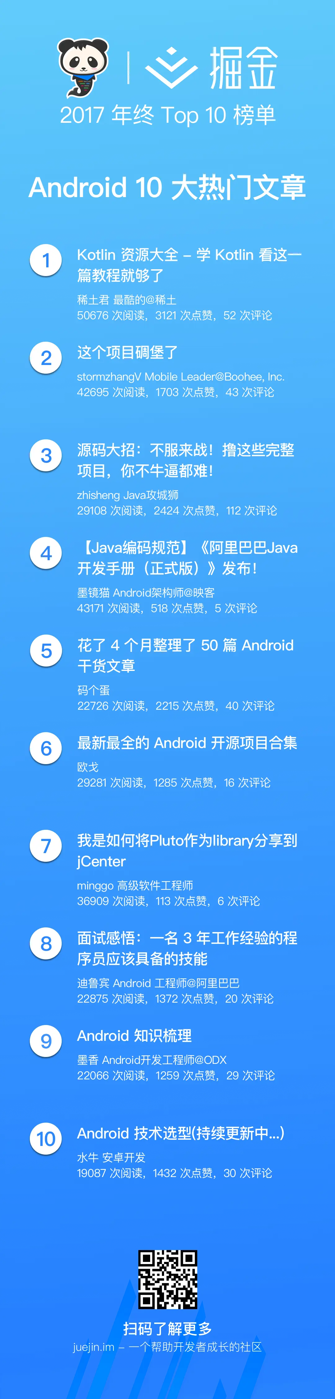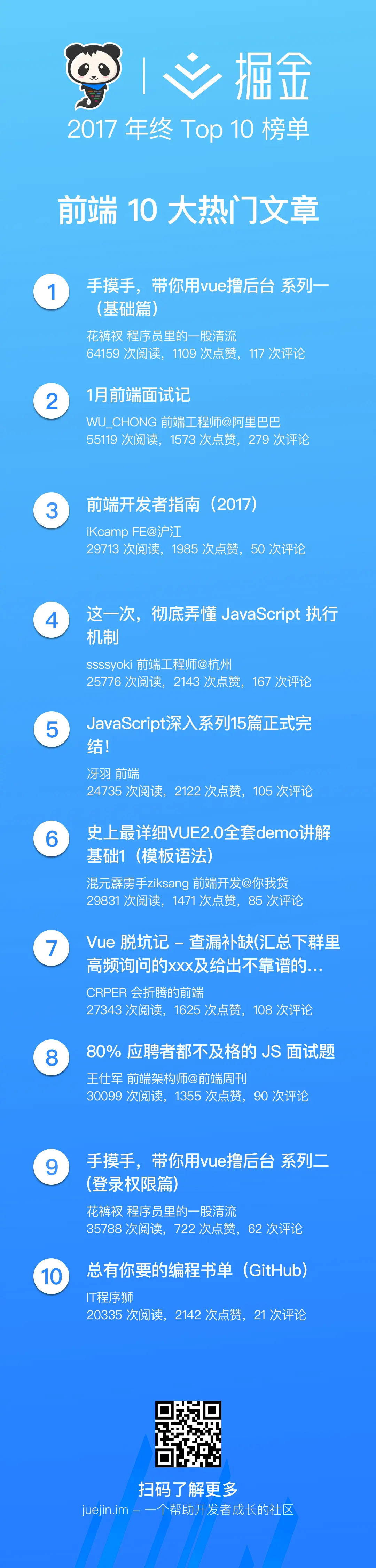 除了 2017 年最热的这 10 篇文章,掘金还为大家总结了各个分类下文章的 Top 10 榜单,请于后面的图片中查看!