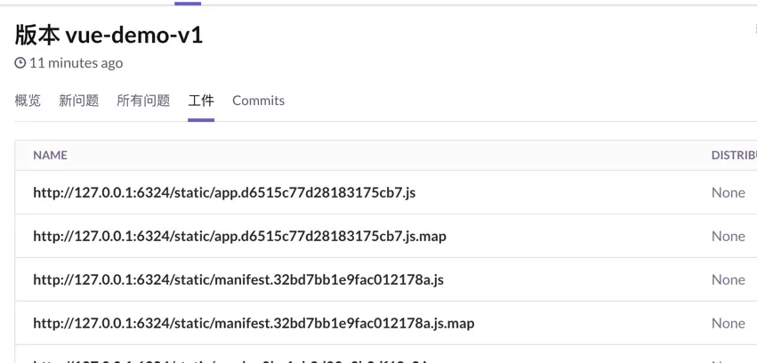 然后在你的在sentry的vue-demo项目中的vue-demo-v1release工作里面看到之前你传上去的文件