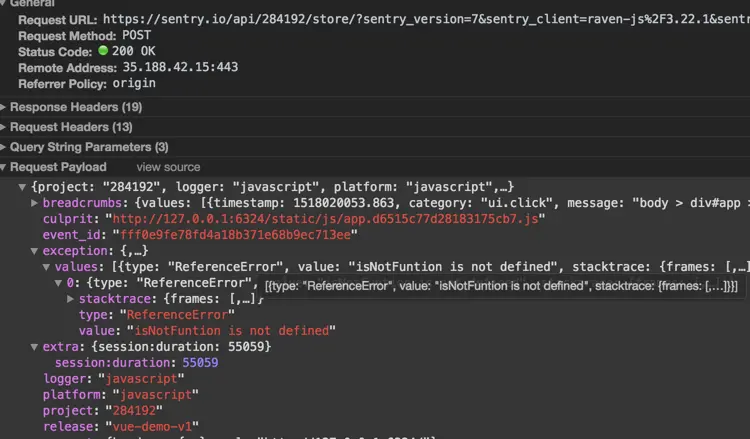 network面板会发现页面向sentry.io发送了一个请求,里面就详细的记录了你这次报错的信息。