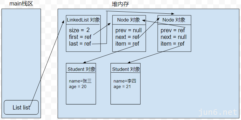 LinkedList底层数据结构是双向链表。- 不能对元素进行随机访问,虽然提供了 get 方法,但这个方法是通过遍历来实现的。