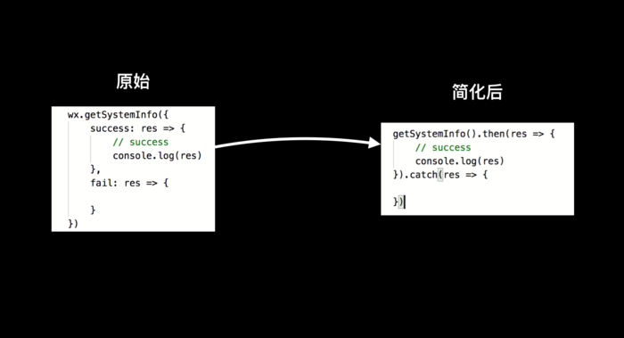 因为微信小程序异步api都是success和fail的形式,所有有人封装了这样一个方法: