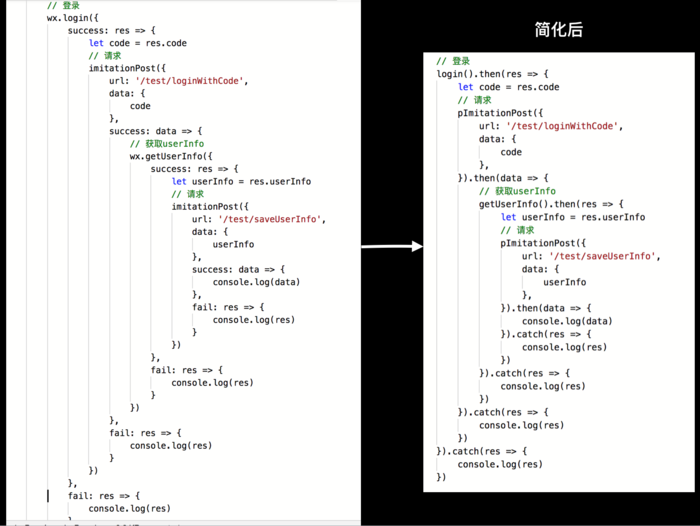 可以看到简化后的回调里少了一个缩进,并且回调函数从9行减少到了6行。