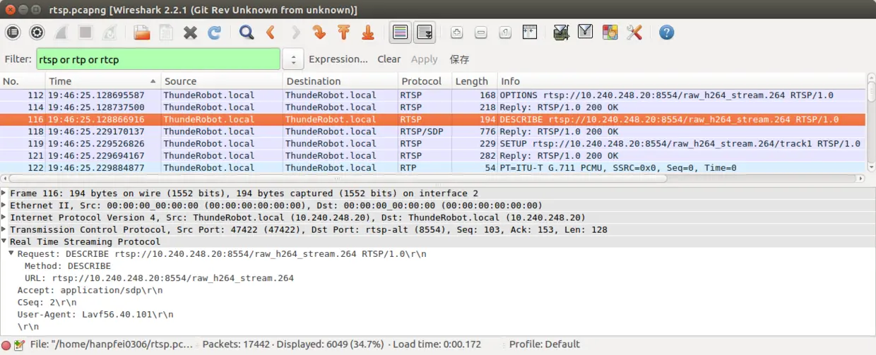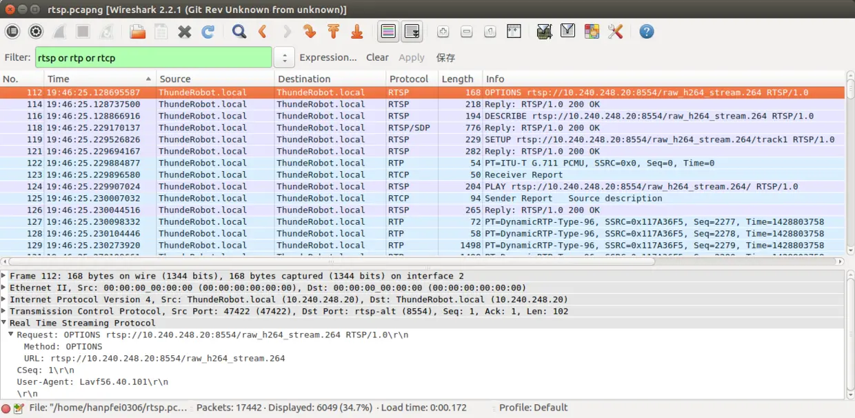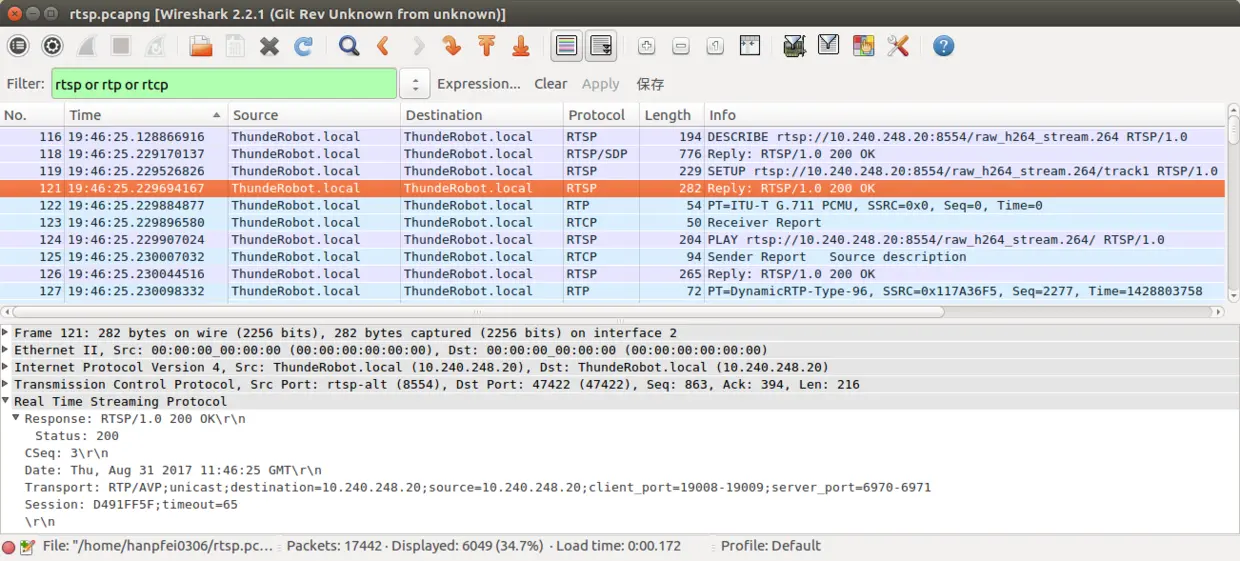 其中 URI 中的 IP 地址为 live555MediaServer 运行的主机的 IP 地址,端口号为其采用的端口号。在 Wireshark 中,通过 Display Filter 过滤仅显示 RTSP/RTP/RTCP 包,将看到类似下面这样的包序列: