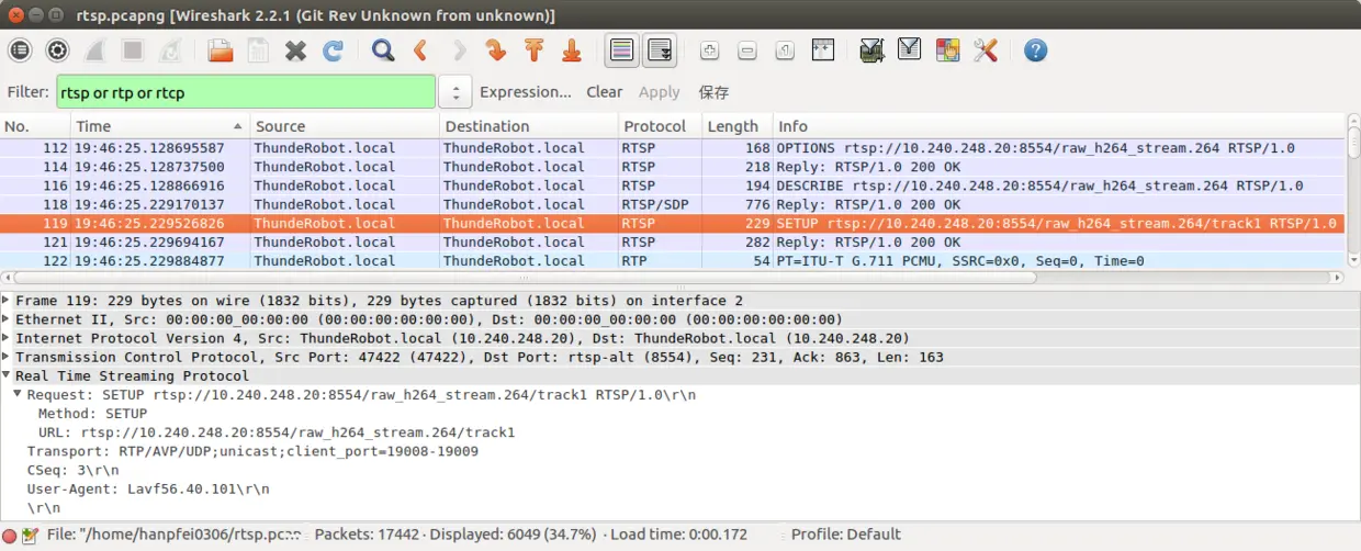 客户端在收到服务器发来的 SDP 包之后,会选择两个端口,分别用于 RTP 和 RTCP 包的收发,并发送了一个 SETUP 请求用于建立媒体会话,如第 119 号包: