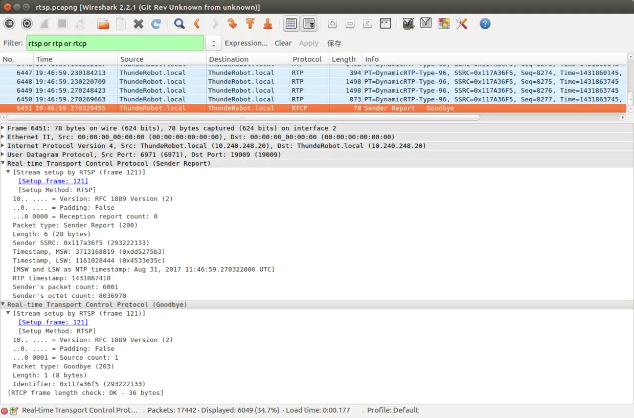 视频数据经过一端时间的稳定传输,最终以服务器向客户端发送的一个 RTCP BYE 包而结束,如第 6451 号包:
