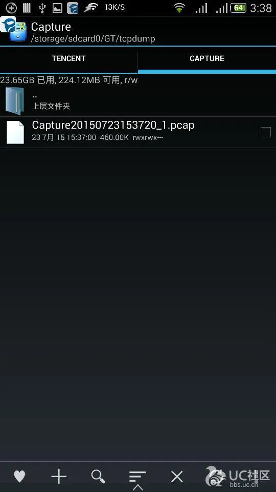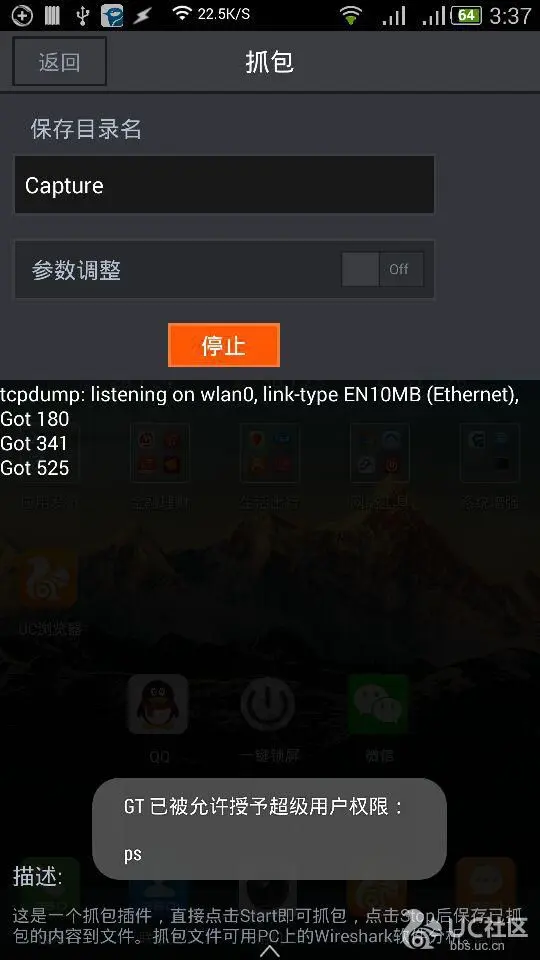 使用GT截包的方法很简单,打开程序,点击下边栏最右的“插件”-“抓包”打开截包界面。然后点击“开始”。因为需要ROOT权限才能使用tcpdump截包,所以此时会弹出权限申请,给予ROOT权限后就开始截包了。正常截包,可以看到下面Got的数字是会不断变大的。如果Got一直为0,则说明未获取到ROOT权限,或出现异常。开始正常截包后,home键将GT切到后台,打开被测程序,进行问题复现。当问题被复现后,回到GT,点击结束,则可生成pcap格式的网络日志包(截图演示如后)。这个包保存在/sdcard/GT/tcpdump/Capture目录下。给我们反馈一些网络劫持或白屏等与网络有关的问题,可以使用此方法,把网络日志包附上,方便我们分析。