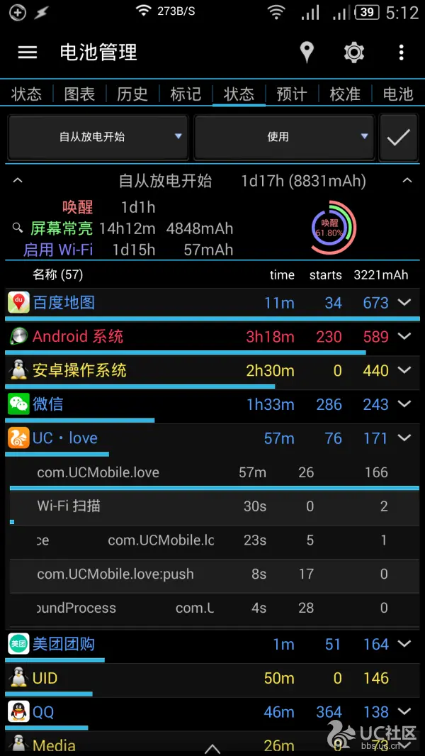 BetterBatteryStats是一个强大的第三方电池管理应用,可以看到开机后或拔掉电源后,手机电量使用的详细情况。例如查看Wakelocks分类,可以看出哪些应用在系统唤醒上消耗了最多电量。