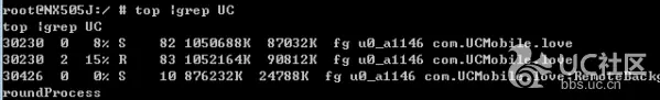 4、输入“top”或“ps”就可以看到手机上所有存活的进程的内存、CPU的占用情况。(为了方便查看,我们可以在命令后加上管道再prep一下,比如“top |grep UC”就可以只看带有“UC”的进程。不过grep不是每个系统都有的)