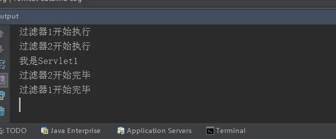 - 首先在过滤器的doFilter()中输出一句话,并且调用chain对象的doFilter()方法