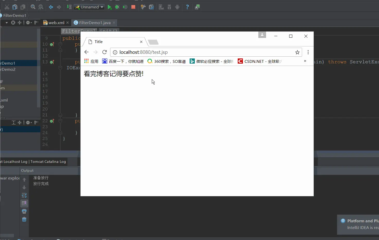 直接看下面的代码。我们已经知道了”准备放行“会被打印在控制台上和test.jsp页面也能被访问得到,但“放行完成“会不会打印在控制台上呢?