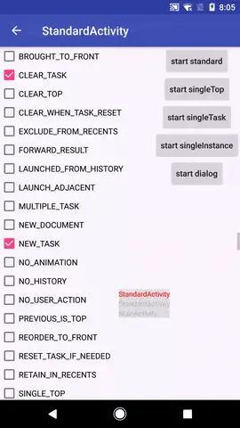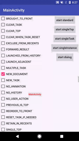 在分析具体的flag之前,介绍一些Activity任务栈相关的概念:Activity、task、tasks、recent tasks list。这些概念都是抽象的,除了Activity和recent tasks list看得见之外,其他都是看不见摸不着的。如果没有直观的视觉感受,即使我说得天花乱坠你也可能还是云里雾里,而有了图甚至动画直接展示它们就不一样了。下面这个工具能很好地帮助我们: