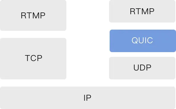 从以上所有的介绍中可以看出,如果我们需要使用 QUIC 改善直播体验,就是用它来代替直播中 TCP 协议所扮演的角色。大家都清楚目前直播所使用的协议都基本是 RTMP 协议,而 RTMP 协议的传输层是基于 TCP 协议。所以七牛的 QUIC 推流方案就是把 RTMP 当中的传输层协议换成 QUIC,从而达到推流卡顿率下降的效果。