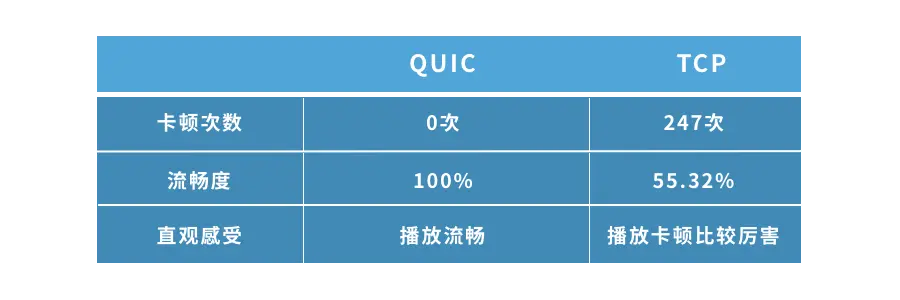 上面说了那么多基于 QUIC 做媒体传输的理论优势,那么有没有实际的实验测试作为理论的支撑呢?下面一起来看看七牛云 QA 团队给出的测试数据吧。