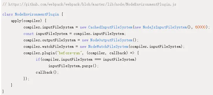 webpack 的 inputFileSystem 会相对更复杂一点,它内部实现了一些缓存的机制,使得性能效率更高。如果对这部分有兴趣,可以从这个 NodeEnvironmentPlugin 插件开始看起,它是内部初始化了 inputFileSystem 和 outputFileSystem: